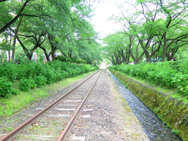 通りと並行して美しい線路と用水路が通っています。