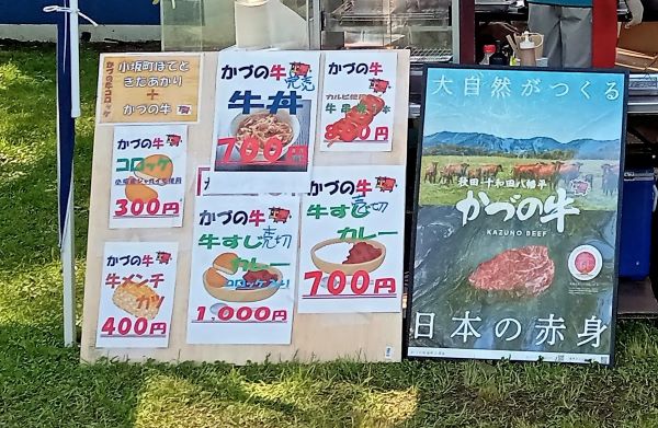 かづの牛の牛丼、牛すじカレー、かつらーめん、アカシア天ぷら、ホルモン焼きそば等々地元の食材や特産品を中心に出店しているお店が数多くならびます。